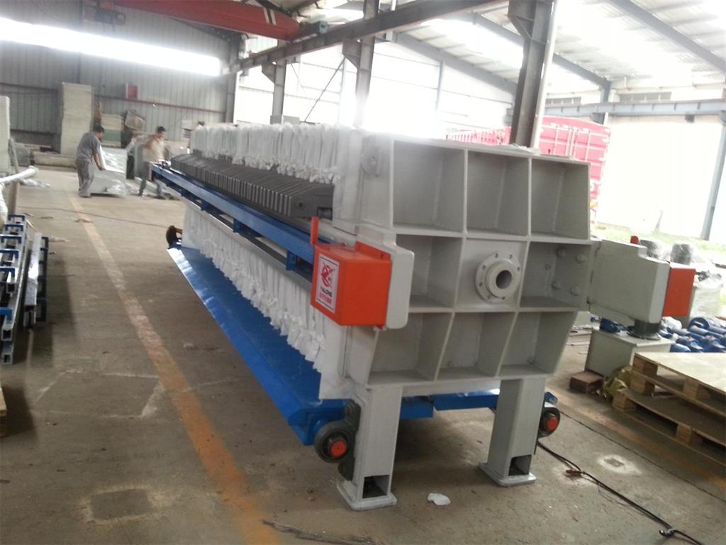 廂式壓濾機濾板下部壓緊面上積存濾餅時,對于重量較輕的濾板組會產(chǎn)生壓緊板端的濾板支承手柄脫離橫梁而上浮的現(xiàn)象,這時濾板可以壓緊;對于金屬濾板組,止推板端各濾板不容易壓緊而產(chǎn)生止推板端噴料。為了解決這個問題,好的措施是:濾板數(shù)超80塊以上的板框壓濾機,其止推板應(yīng)采用自由回轉(zhuǎn)的結(jié)構(gòu),對于濾板數(shù)較少的廂式壓濾機,卸料時應(yīng)注意減少濾板下部壓緊面上的殘留濾餅量,—旦濾板集合體呈明顯的梯形狀態(tài),應(yīng)該沖洗濾板,將殘留濾餅清理干凈。