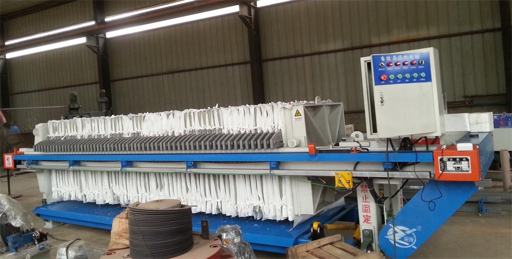 濾布單行走式自動(dòng)廂式壓濾機(jī)工作時(shí)料漿從頂部進(jìn)料口送入,經(jīng)過進(jìn)料、壓榨、洗滌、吹風(fēng)干燥后,油缸啟動(dòng),將各濾室同時(shí)打開。濾布包著濾餅向下行走,濾餅很容易從濾布上卸除,同時(shí)高壓水對(duì)濾布進(jìn)行清洗。整個(gè)過程能自動(dòng)實(shí)現(xiàn),大大節(jié)省了人力操作。